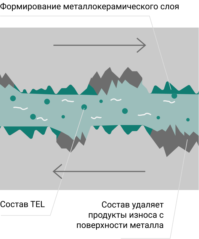 На помощь приходят триботехнические составы марки TEL, максимально снижающие и даже исключающие износ. Все этапы восстановления повреждённых поверхностей, а также процессы образования уникального слоя происходят на молекулярном уровне, поэтому составы TEL можно по-научному назвать наномодификаторами. Они формируют защитный слой, представляющий собой стекловидную структуру. Он образуется на поверхности металла именно такой толщины, которая нужна для компенсации износа. Толщина зависит от степени повреждения поверхности металла, от количества состава, от выделяемой энергии – в местах наибольшего износа выделяется больше всего энергии, там и начинается формирование металлокерамического слоя. После того, как произошло выравнивание геометрии, трение снижается, выделение энергии уменьшается, температура падает, нарастание слоя постепенно прекращается и останавливается, когда поверхность становится достаточно отполированной.